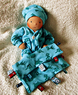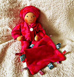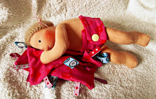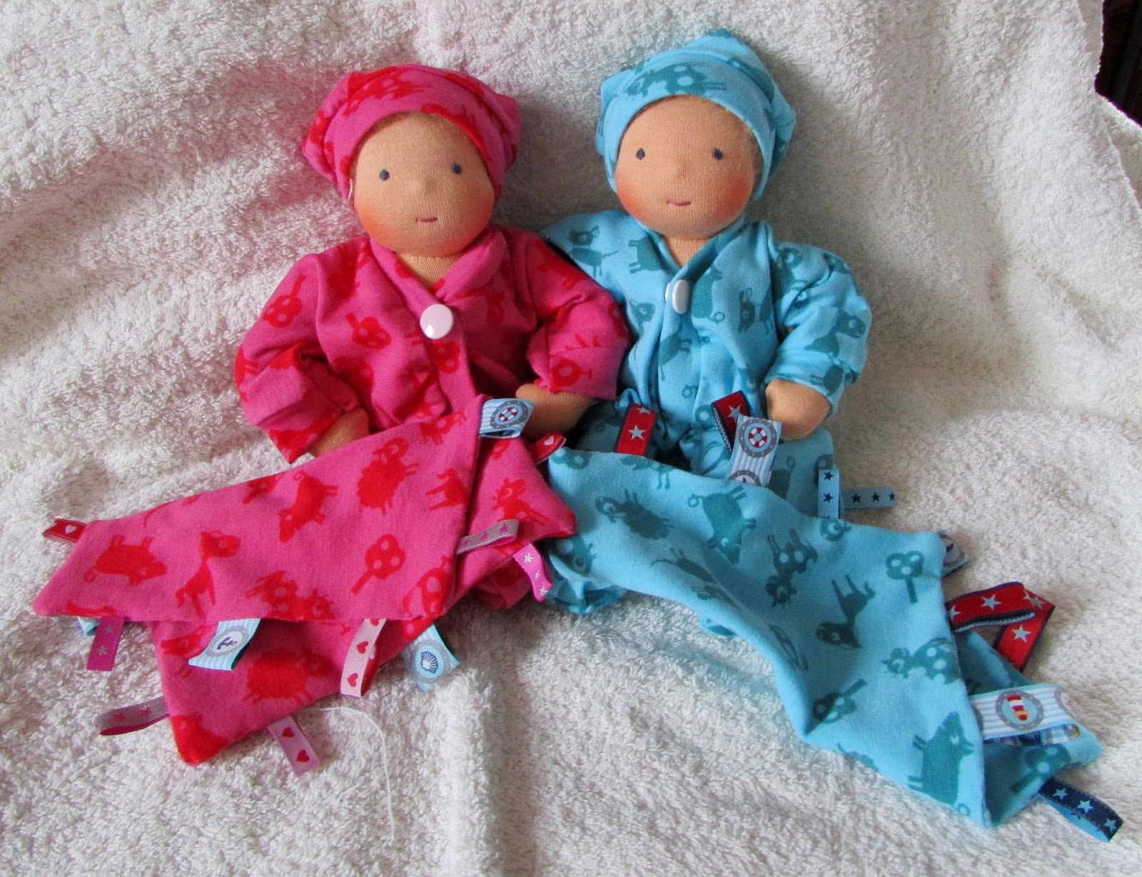 ByTheresaThese 3 pocket babies were born today. Made from the lovely cotton velours I already used for the blanket dolls and for Miss A’s jacket.Stuffed with wool from NSW. They jumped into Anianas pockets 🙂 And had a cuddle with Miranda too. I also packed my suitcase for Germany…Only 1 day left, then we gooooo!…